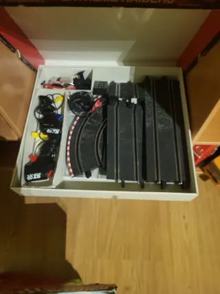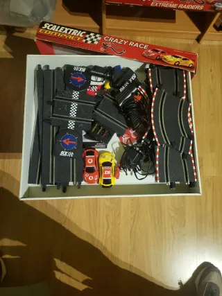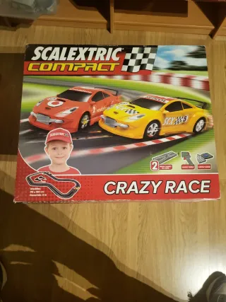 Circuito de carreras Scalextric Compacto, modelo Crazy Race. Incluye dos coches y accesorios para montar la pista. - Coches: 1 rojo y 1 amarillo. - Medidas del recorrido: 90 x 180 cm. - Longitud del recorrido: 5 m.