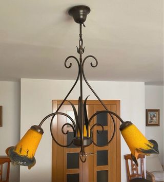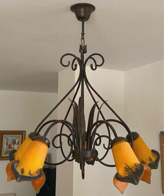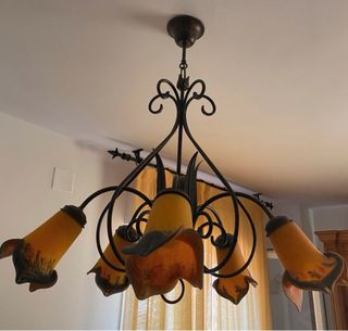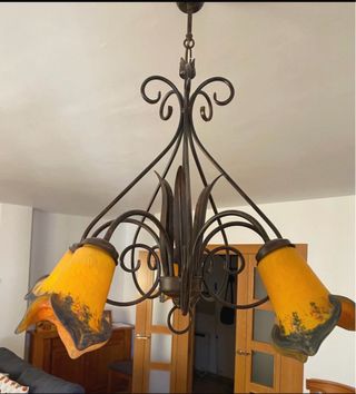 Elegante lámpara de techo con cinco brazos y tulipas de cristal. - Diseño con estructura de metal. - Tulipias en forma de flor con detalles en amarillo y marrón.