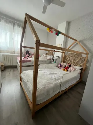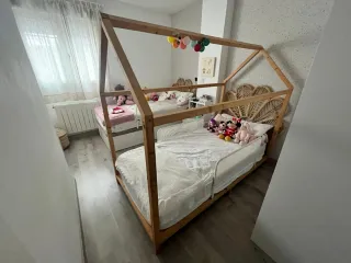 Cama de 90 estilo Montessori de madera, ideal para fomentar la autonomía. - Estructura de madera natural. - Diseño de casa. - Colchón y barreras no incluidas.