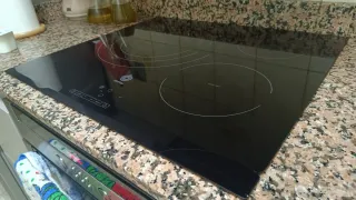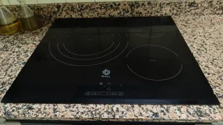 Vitrocerámica Balay de inducción con superficie de cristal negro. - Diseño moderno y elegante. - Mandos táctiles. - Tiene una pequeña rotura en el lado derecho, se aprecia en las fotos. - Funciona perfectamente.