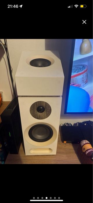 Pack de altavoces Jamo en color blanco y madera. - Altavoz superior con driver. - Altavoz inferior con driver y tweeter. - Incluye receptor AV.