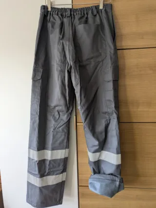 Pantalón de trabajo de color gris, diseñado para ofrecer visibilidad. Talla 48 o 50 - Dos bolsillos cargo en los laterales. - Bandas reflectantes plateadas en la parte inferior de las piernas. De invierno forrado por dentro con forro polar, 15€ De verano. 10€