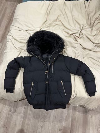 Chaqueta acolchada negra con capucha de pelo perlado. • NUEVA, SIN ESTRENAR. - Bolsillos laterales con cremallera y bolsillo interior con cremallera. - Todas las cremalleras y simbolos de la chaqueta, en color dorado metalico. - Puños elásticos. - Es una chaqueta caliente. - Muy buena calidad tanto interior, exterior y acabados. • Se vende por que la compré en una talla equivocada. •NEGOCIABLE, preguntar sin compromiso, respondo rapido.