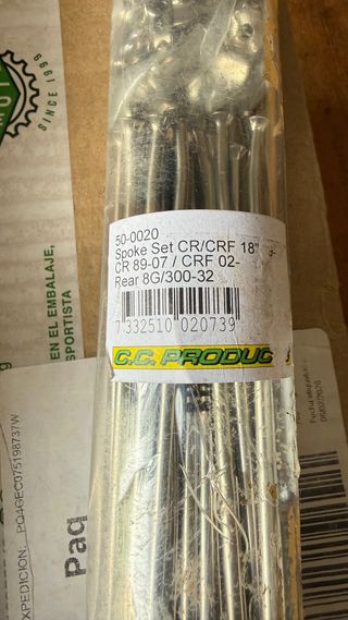 Radios de alta calidad para motos de enduro. Nuevos. Embalaje original. - Marca: C.C. PRODUCTS - Modelo: HONDA CR/CRF - Color: Plateado Llantas de 21” delante y 18” trasera. A estrenar, error al comprarlos.