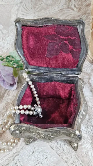 Elegante joyero antiguo con un acabado plateado y un interior forrado en tela jacquard burgundy - Diseño ornamentado. - Forro interior de tela. - Ideal para guardar bisutería o pequeños objetos.