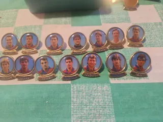Colección de pines de jugadores del F.C. Barcelona. - Diseños con retratos de futbolistas. - Borde metálico dorado. - Incluye nombres de jugadores en la base.