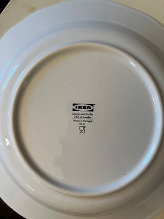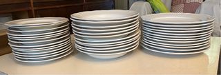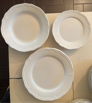 Conjunt de 18 peces blanques amb diseny elegant. 6 plats de cada. Són plats grans. Postre = 22cm Pla = 28,5cm Soper = 26,5cm