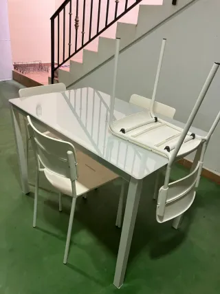 Mesa cristal y 4 sillas blancas