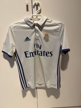 Camiseta oficial del Real Madrid con el patrocinio de Fly Emirates. - Diseño clásico en blanco con detalles en azul. - Logo de Adidas y escudo del club. - Cuello tipo polo con botones.