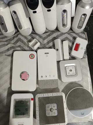 Conjunto de dispositivos para un sistema de alarma de seguridad. - Sensores de movimiento. - Sensores de apertura para puertas y ventanas. - Panel de control con botones. - Mando a distancia. - Base con altavoz.