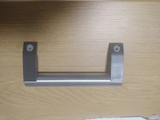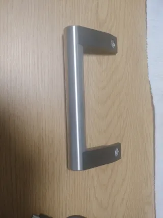 Tirador de metal plateado con soportes negros para frigorífico o congelador. Diseño moderno y funcional. - Material: Metal y plástico. - Color: Plateado y negro. - Montaje: Tornillos (no incluidos).