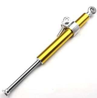 Amortiguador de dirección universal para motocicleta. Amortiguador de dirección Universal de aleación de aluminio, gold, 330MM, accesorios, estabilizador de horquilla, amortiguador de dirección de motocicleta. Incluye los adaptadores de 43mm y de 50mm - Cuerpo principal en color dorado. - Incluye soportes de montaje y tornillería.