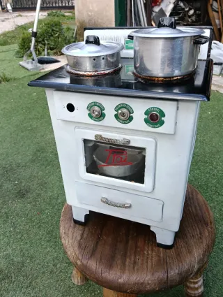 Preciosa cocina eléctrica de la marca Payá, ideal para coleccionistas. - Diseño vintage. - Acabado en blanco y negro. - Incluye dos fuegos y horno. Cacerolas bandeja horno y folleto de recetas de juguetes Payá