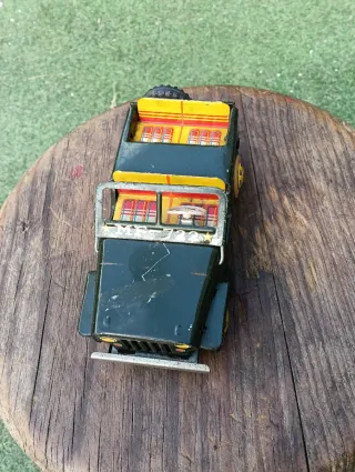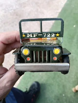 Este es un Jeep de chapa, ideal para coleccionistas. Presenta un diseño clásico y robusto. - Color verde militar. - Detalle de estrellas y número MF-722. - Parachoques metálico.