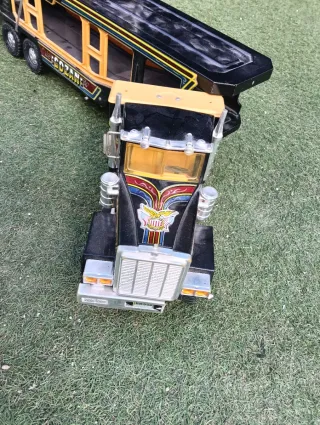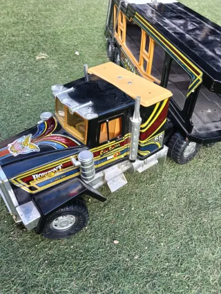 Camión porta coches de juguete, modelo Gozan. - Cabina negra con detalles dorados y rojos. - Remolque negro con detalles amarillos y azules. - Ruedas de goma negras. Tiene roto un trozo de paragolpes y retrovisor comductor