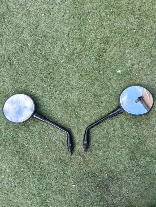Par de retrovisores para moto, con un diseño clásico y elegante. - Cuerpo y brazo de metal negro. - Espejo redondo. - Ideales para motos custom o clásicas.