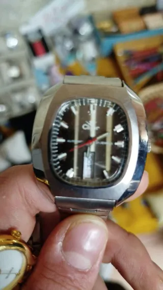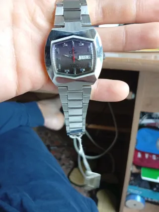 Cliper automatic 25 jewels, conservando pegatina y etiqueta con las mismas dos complicaciones anteriores, datado de 1972-1976. Caja tipo TV/trapezoidal con esfera fumé/degradada gris-marron, reloj "total-dress". Acero inoxidable macizo no cromado con aristas vivas. Segundero rojo y brazalete coetáneo integrado. El sistema es híbrido puesto que es automático y de cuerda.Precio negociable y posibilidad de lote con los otros del perfil.