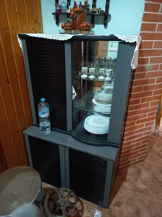 2Muebles modulares con vitrina de cristal y compartimentos de almacenaje. - Diseño moderno en color negro y gris. - Estantes interiores de cristal. - Puertas inferiores con acabado acanalado.