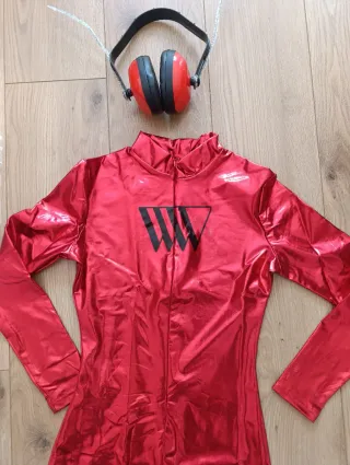 Disfraz de Umpa-Lumpa inspirado en Charlie y la fábrica de chocolate. - Mono rojo brillante. - Detalle de logo negro en el pecho. - Incluye diadema con auriculares rojos y antenas. Disfraz para niños talla 9-10 mono elástico adaptado a niños , el largo está cortado, mi hija llevó calcetines de rayas y guantes de rayas, como se ve en la foto.Incluye mono y cascos.