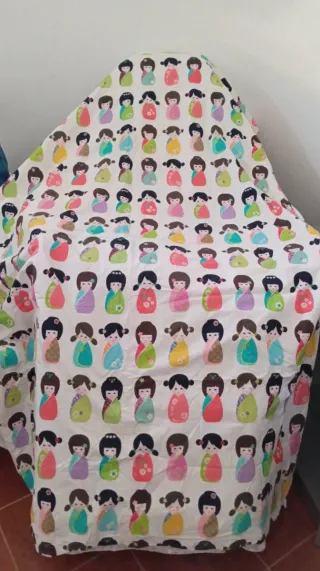 Funda de edredón infantil con un alegre estampado de muñecas. - Diseño de muñecas kokeshi. - Ideal para cama individual. - Estampado colorido sobre fondo blanco.