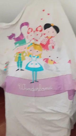 Funda nórdica infantil con un divertido diseño de Alicia en el País de las Maravillas. Ideal para camas individuales. Pequeño defecto en una esquina. - Personajes de Alicia en el País de las Maravillas. - Incluye el texto Wonderland.