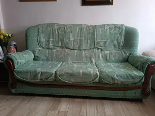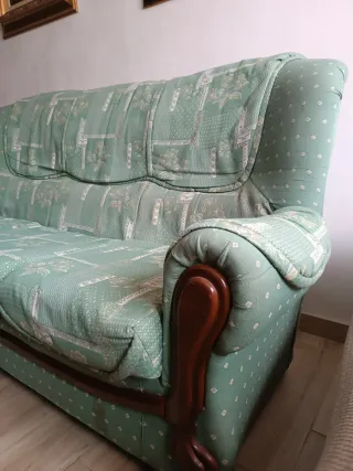 Sofá de tres plazas con un diseño clásico y cómodo. Su tapicería de tela en tono verde le da un toque acogedor a cualquier estancia. - Estructura de madera. - Patas de madera oscura.