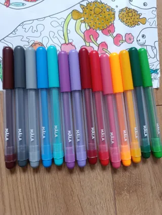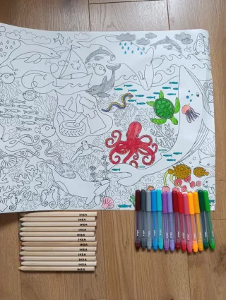 Lote de material de dibujo de la marca Ikea. - Incluye lápices de colores. - Incluye rotuladores de colores. -Incluye rollo de papel con dibujos para colorear.