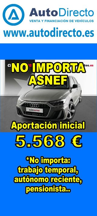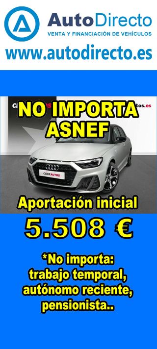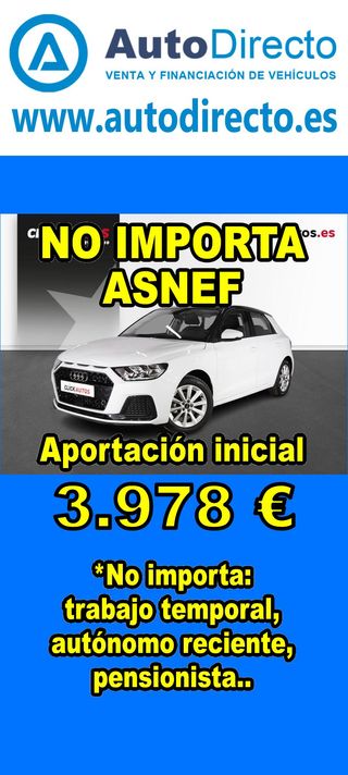 ¿No consigues financiación? ¡Tenemos la solución! RENT CREDIT (Alquiler con opción a compra) *************************************************************************** ✅ Aprobamos más del 95% de las operaciones. ✅ No importa ASNEF o RAI, impagos pendientes, ser autónomo o empresa reciente, ser pensionista. \\n ✅ Imprescindible aportación inicial del 20%. ✅ Ejemplo de operación: AUDI A1 SPORTBACK 30 1.0 TFSI 110CV ADVANCED STRONIC. Ref. W950291MFS - Precio vehículo: 19890 €. - Aportación inicial de 3978 €. - Cuota mes desde 415 €. ✅ Impuesto de circulación y garantía de 1 año incluidos. *************************************************************************** ✅ Más de 3.000 VEHÍCULOS EN STOCK. ✅ Kilómetros certificados. ✅ 17 concesionarios repartidos en toda España. ♻️ Aceptamos tu coche como parte de la operación. *************************************************************************** IMPORTANTE: -. Este anuncio, no es vinculante, puede contener errores. SE MUESTRAN A TÍTULO INFORMATIVO Y NO CONTRACTUAL. -. Consultar disponibilidad del vehículo y datos exactos: fecha de matriculación, importes, etc,... *************************************************************************** Te ofrecemos distintas opciones: Venta al contado, financiación, renting, RENT CREDIT (Alquiler con opción a compra).