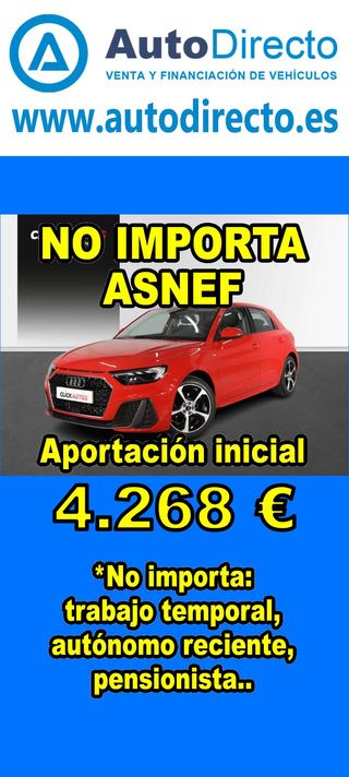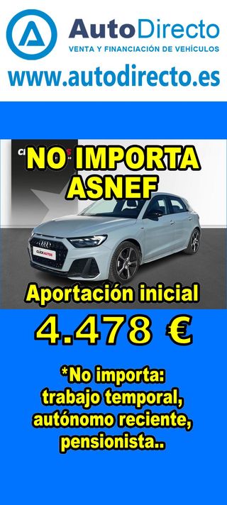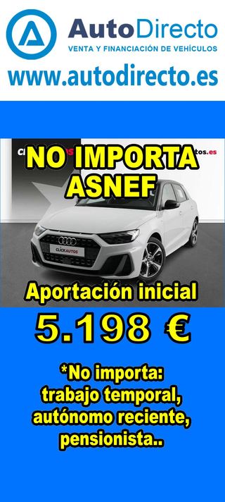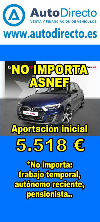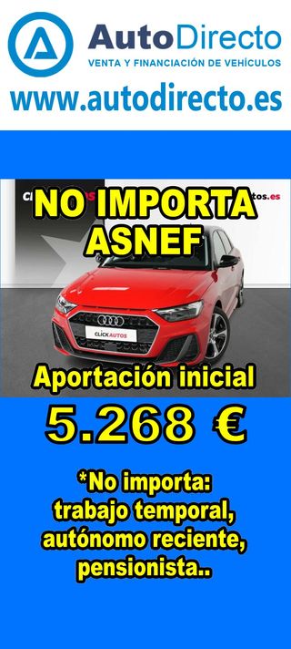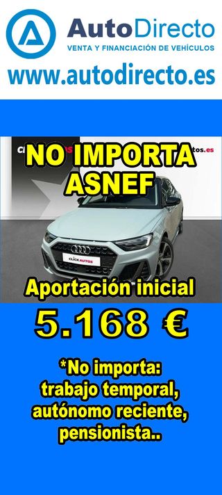 ¿No consigues financiación? ¡Tenemos la solución! RENT CREDIT (Alquiler con opción a compra) *************************************************************************** ✅ Aprobamos más del 95% de las operaciones. ✅ No importa ASNEF o RAI, impagos pendientes, ser autónomo o empresa reciente, ser pensionista. \\n ✅ Imprescindible aportación inicial del 20%. ✅ Ejemplo de operación: AUDI A1 SPORTBACK 30 TFSI 110CV ADVANCED STRONIC. Ref. W950302MFS - Precio vehículo: 20240 €. - Aportación inicial de 4048 €. - Cuota mes desde 422 €. ✅ Impuesto de circulación y garantía de 1 año incluidos. *************************************************************************** ✅ Más de 3.000 VEHÍCULOS EN STOCK. ✅ Kilómetros certificados. ✅ 17 concesionarios repartidos en toda España. ♻️ Aceptamos tu coche como parte de la operación. *************************************************************************** IMPORTANTE: -. Este anuncio, no es vinculante, puede contener errores. SE MUESTRAN A TÍTULO INFORMATIVO Y NO CONTRACTUAL. -. Consultar disponibilidad del vehículo y datos exactos: fecha de matriculación, importes, etc,... *************************************************************************** Te ofrecemos distintas opciones: Venta al contado, financiación, renting, RENT CREDIT (Alquiler con opción a compra).