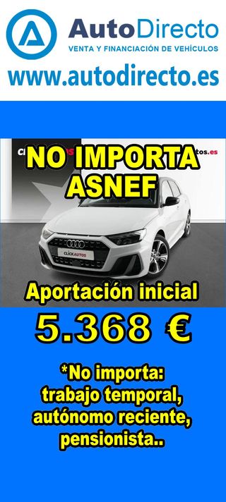 ¿No consigues financiación? ¡Tenemos la solución! RENT CREDIT (Alquiler con opción a compra) *************************************************************************** ✅ Aprobamos más del 95% de las operaciones. ✅ No importa ASNEF o RAI, impagos pendientes, ser autónomo o empresa reciente, ser pensionista. \\n ✅ Imprescindible aportación inicial del 20%. ✅ Ejemplo de operación: AUDI A1 SPORTBACK 30 1.0 TFSI 116CV ADVANCED. Ref. W953897MZW - Precio vehículo: 23490 €. - Aportación inicial de 4698 €. - Cuota mes desde 489 €. ✅ Impuesto de circulación y garantía de 1 año incluidos. *************************************************************************** ✅ Más de 3.000 VEHÍCULOS EN STOCK. ✅ Kilómetros certificados. ✅ 17 concesionarios repartidos en toda España. ♻️ Aceptamos tu coche como parte de la operación. *************************************************************************** IMPORTANTE: -. Este anuncio, no es vinculante, puede contener errores. SE MUESTRAN A TÍTULO INFORMATIVO Y NO CONTRACTUAL. -. Consultar disponibilidad del vehículo y datos exactos: fecha de matriculación, importes, etc,... *************************************************************************** Te ofrecemos distintas opciones: Venta al contado, financiación, renting, RENT CREDIT (Alquiler con opción a compra).