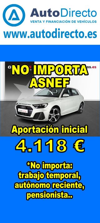 ¿No consigues financiación? ¡Tenemos la solución! RENT CREDIT (Alquiler con opción a compra) *************************************************************************** ✅ Aprobamos más del 95% de las operaciones. ✅ No importa ASNEF o RAI, impagos pendientes, ser autónomo o empresa reciente, ser pensionista. \\n ✅ Imprescindible aportación inicial del 20%. ✅ Ejemplo de operación: AUDI A1 SPORTBACK 30 TFSI 110CV ADVANCED STRONIC. Ref. W950294MFS - Precio vehículo: 20390 €. - Aportación inicial de 4078 €. - Cuota mes desde 425 €. ✅ Impuesto de circulación y garantía de 1 año incluidos. *************************************************************************** ✅ Más de 3.000 VEHÍCULOS EN STOCK. ✅ Kilómetros certificados. ✅ 17 concesionarios repartidos en toda España. ♻️ Aceptamos tu coche como parte de la operación. *************************************************************************** IMPORTANTE: -. Este anuncio, no es vinculante, puede contener errores. SE MUESTRAN A TÍTULO INFORMATIVO Y NO CONTRACTUAL. -. Consultar disponibilidad del vehículo y datos exactos: fecha de matriculación, importes, etc,... *************************************************************************** Te ofrecemos distintas opciones: Venta al contado, financiación, renting, RENT CREDIT (Alquiler con opción a compra).