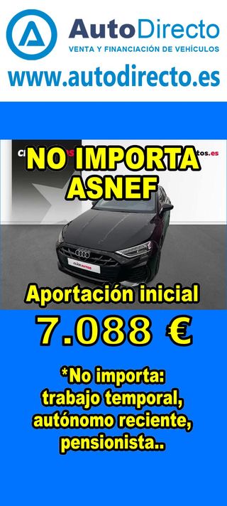 ¿No consigues financiación? ¡Tenemos la solución! RENT CREDIT (Alquiler con opción a compra) *************************************************************************** ✅ Aprobamos más del 95% de las operaciones. ✅ No importa ASNEF o RAI, impagos pendientes, ser autónomo o empresa reciente, ser pensionista. \\n ✅ Imprescindible aportación inicial del 20%. ✅ Ejemplo de operación: AUDI A3 SPORTBACK 2.0 TDI 150CV 35 SLINE STRONIC. Ref. W957884NCL - Precio vehículo: 35440 €. - Aportación inicial de 7088 €. - Cuota mes desde 732 €. ✅ Impuesto de circulación y garantía de 1 año incluidos. *************************************************************************** ✅ Más de 3.000 VEHÍCULOS EN STOCK. ✅ Kilómetros certificados. ✅ 17 concesionarios repartidos en toda España. ♻️ Aceptamos tu coche como parte de la operación. *************************************************************************** IMPORTANTE: -. Este anuncio, no es vinculante, puede contener errores. SE MUESTRAN A TÍTULO INFORMATIVO Y NO CONTRACTUAL. -. Consultar disponibilidad del vehículo y datos exactos: fecha de matriculación, importes, etc,... *************************************************************************** Te ofrecemos distintas opciones: Venta al contado, financiación, renting, RENT CREDIT (Alquiler con opción a compra).