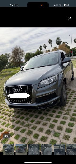 se vende AUDI Q7 3.0 V6 TDI 245 CV automatico, de 7 plazas. Nacional con historial de mantenimiento y kms demostrables con documentación, en impecable estado tanto de interior como de exterior. Full equip el mas alto de la gama incorpora: tapiceria en cuero, conducción deportiva, reductora 4x4 ON-ROAD/OFF-ROAD, alarma volumetrica, Faros Bi-Xenon, Asientos de cuero calefactables, pantalla tactil, luz diurna de LED, climatizador digital, paquete multimedia completo, bluetooth, navegador, Luces automáticas, espejos retrovisores eléctricos plegables con indicador angulo muerto, Cargador de CDs, Control de velocidad, Volante multifunción, Control por voz, 4x4, Start Stop, sistema HOLD, ect... Etiqueta medio ambiental B, siempre ha dormido en garaje. Mantenimiento realizado e itv al dia; interesados mejor ver y probar sin ningun compromiso, se acepta cualquier prueba mecanica, un saludo