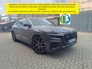 Precio al contado 57.990€ Precio financiado 56.990€ IVA DEDUCIBLE (21%) Excelente unidad Audi Q8 50 TDI S-Line quattro tiptronic 210 kW (286 CV), Etiqueta ECO, Historial en servicio oficial, Vehículo nacional, Sistema de seguridad airbags, Aparcamiento asistido, Asistente de emergencia, Asistente de luces de carretera, Asistente de ángulo muerto Side Assist, Audi pre sense city, Aviso de abandono de carril, Ayuda al aparcamiento delantero y trasero, Cámara 360º, Cross traffic, Pre sense rear, Reconocimiento de señales de tráfico, Suspensión neumática, Suspensión deportiva, Faros Matrix LED, Lavafaros, Retrovisores exteriores abatibles eléctricamente, Aire acondicionado, Climatizador de cuatro zonas, Acceso sin llave, Asientos delanteros deportivos con regulación eléctrica, memoria y calefacción, Tapicería de cuero, Cortinillas traseras eléctricas, Iluminación de ambiente, Portón del maletero eléctrico, Techo panorámico eléctrico (dos piezas, delantera corrediza y abatible), Audi virtual cockpit de 31,2 cm (12,3"), Pantalla en color de 25,7 cm, Sonido Bang & Olufsen Premium (16 canales, 17 altavoces, 730 W), MMI navegación plus, Android auto y Apple CarPlay, Llantas R22", etc... TODOS NUESTROS VEHICULOS SE ENTREGAN REVISADOS. PÓLIZA DE 12 MESES DE GARANTÍA DISPONIBLE. CAMBIO DE TITULARIDAD Y GESTIÓN DOCUMENTAL 150€ SOBRE EL PRECIO. OFRECEMOS LA POSIBILIDAD DE ENVIAR EL VEHÍCULO EN GRÚA HASTA LA PUERTA DE SU DOMICILIO (Coste Adicional).