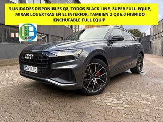 IMPORTANTE: NO INCLUYE GASTOS DE GESTORIA NI DE TRANSMISIONES NO ENCONTRARÁ NINGUN COCHE NACIONAL POR ESTE PRECIO COMO EL NUESTRO, TENEMOS 7 AUDI Q8 DISPONIBLES, HIBRIDOS PEGATINA ECO Y TAMBIEN ENCHUFABLES PEGATINA CERO. VEHÍCULO TOPE DE GAMA, 340 CV, HIBRIDO, SUPER FULL. TODAS LAS REVISIONES EN CASA OFICIAL AUDI MOTORSOL IMPORT. EL UNICO POR ESTE PRECIO CON EJE TRASERO DIRECCIÓN, MUY DIFICIL DE ENCONTRAR. EXTRAS: Apoyabrazos central delantero confort. Paquete exterior S line. Parachoques delantero y trasero con diseño deportivo específico S line..Máscara del singleframe en gris platino mate.Parrilla en negro titán con marco cromado.Entradas laterales de aire delanteras en negro titán mate.Difusor trasero en negro titán mate, con inserción en gris platino mate Molduras laterales específicas en color carrocería con inserciones gris platino.Inscripción S line en los laterales Radio Digital DAB. Asistente de aparcamiento park assist. Mide el hueco y realiza la maniobra de aparcamiento, válido para aparcar en línea o batería, el conductor actúa sobre acelerador y freno Cierre servoasistido de las puertas Maletero con apertura y cierre eléctrico Rueda de repuesto de emergencia. Velocidad máxima 80km/h Volante deportivo cuero multifuncional 3 radios S-line achatado con levas de cambio, calefactable. Barras longitudinales en negro Paquete de asistentes City. Incluye: Audi Parking System plus. Cámara trasera. Audi side assist. Audi pre sense rear. Audi pre sense basic. Cross traffic (asistente de salida en batería). Exit warning (asistente para apertura de puertas) Tapicería S-Line Banqueta trasera plus Regulable longitudinalmente Respaldos traseros regulables en inclinación Pinzas de freno rojas Neumáticos 285/40R22 negro antracita brillante Asientos delanteros deportivos plus eléctricos con memoria Cristales tintados Audi connect con eSim Audi connect: Safety & Service con eSIM integrada de fábrica. Incluye:MyService (10