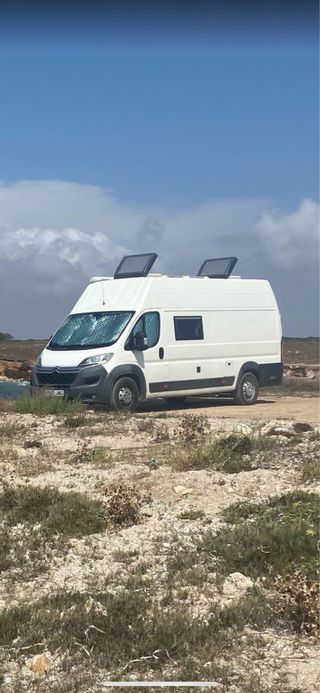Se vende Citroen Jumper 2018 Furgoneta camper con todos los extras 4 plazas viajar y dormir. Control de crucero, cámara marcha atrás, seis velocidades, motor, embrague, y todo lo mecanico a estrenar y con garantía hasta 2027, dos llaves, se entrega con la itv pasada. Equipamiento camper compuesto por asientos giratorios, salón para cuatro, horno y fuegos a gas, lavabo de piedra integrado, frigorífico ikohs grande con congelador aparte, amplio baño, ducha y retrete químico a estrenar, cama de 1’85x150, colchón viscoelástico. Placa solar, inversor, controlador de placa y toda la instalacion es de marca Victron con control por bluetooth. Instalacion electrica nueva, enchufes a 12 y a 220, iluminación led, agua caliente en camping, deposito de agua de 100 litros y de agua sucia de 75, calefacción estacionaria westfalia, dos claraboyas batientes y respirador en el baño, ventanas con apertura, persiana y mosquitera. oscurecedores 7 capas y portabicis thule todo homologado en ficha. Muchos huecos, amplios armarios y opciones de almacenaje. En muy buenas condiciones tanto de interior como de exterior, furgoneta con garantía hasta 2028 y lista para hacer muchos kilómetros. Cualquier duda preguntar Precio negociable