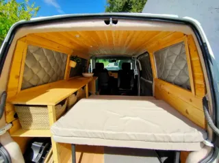 Furgoneta Volkswagen T4 camper de 1992. 260000 km, 2 plazas. Camperizacion homologada, consta de: Aislamiento Kaiflex Oscurecedores para todo el habitáculo Segunda batería conectada a una placa solar (100w) Nevera Mobicool fr40 Iluminación LED Entradas de mechero 12v y USB Fregadero con bomba de agua a 12v Depósito de aguas limpias de 40L Cocina Ducha exterior Cama retráctil con dos posiciones(116x195cm) Cajones de almacenamiento Revestida completamente de madera