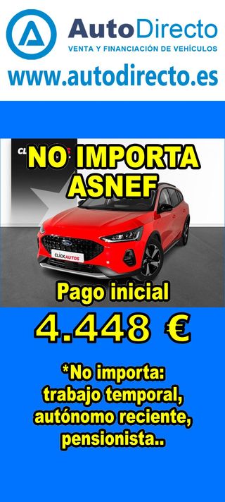 ¿No consigues financiación? ¡Tenemos la solución! RENT CREDIT (Alquiler con opción a compra) *************************************************************************** ✅ Aprobamos más del 95% de las operaciones. ✅ No importa ASNEF o RAI, impagos pendientes, ser autónomo o empresa reciente, ser pensionista. ✅ Imprescindible aportación inicial del 20%. ✅ Ejemplo de operación: FORD FOCUS SPORTBREAK 1.0 ECOBOOST 155CV MHEV ACTIVE. Ref. W956590MNN - Precio vehículo: 22240 €. - Aportación inicial de 4448 €. - Cuota mes desde 463 €. ✅ Impuesto de circulación y garantía de 1 año incluidos. *************************************************************************** ✅ Más de 3.000 VEHÍCULOS EN STOCK. ✅ Kilómetros certificados. ✅ 17 concesionarios repartidos en toda España. ♻️ Aceptamos tu coche como parte de la operación. *************************************************************************** IMPORTANTE: -. Este anuncio, no es vinculante, puede contener errores. SE MUESTRAN A TÍTULO INFORMATIVO Y NO CONTRACTUAL. -. Consultar disponibilidad del vehículo y datos exactos: fecha de matriculación, importes, etc,... *************************************************************************** Te ofrecemos distintas opciones: Venta al contado, financiación, renting, RENT CREDIT (Alquiler con opción a compra).