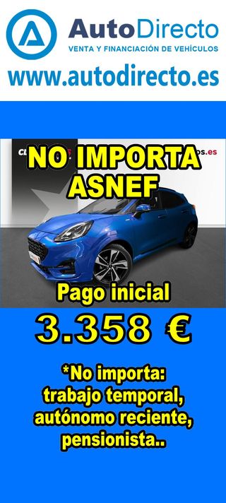 ¿No consigues financiación? ¡Tenemos la solución! RENT CREDIT (Alquiler con opción a compra) *************************************************************************** ✅ Aprobamos más del 95% de las operaciones. ✅ No importa ASNEF o RAI, impagos pendientes, ser autónomo o empresa reciente, ser pensionista. ✅ Imprescindible aportación inicial del 20%. ✅ Ejemplo de operación: FORD PUMA 1.0 ECOBOOST 155CV MHEV STLINE X. Ref. W959083MTG - Precio vehículo: 20290 €. - Aportación inicial de 4058 €. - Cuota mes desde 423 €. ✅ Impuesto de circulación y garantía de 1 año incluidos. *************************************************************************** ✅ Más de 3.000 VEHÍCULOS EN STOCK. ✅ Kilómetros certificados. ✅ 17 concesionarios repartidos en toda España. ♻️ Aceptamos tu coche como parte de la operación. *************************************************************************** IMPORTANTE: -. Este anuncio, no es vinculante, puede contener errores. SE MUESTRAN A TÍTULO INFORMATIVO Y NO CONTRACTUAL. -. Consultar disponibilidad del vehículo y datos exactos: fecha de matriculación, importes, etc,... *************************************************************************** Te ofrecemos distintas opciones: Venta al contado, financiación, renting, RENT CREDIT (Alquiler con opción a compra).