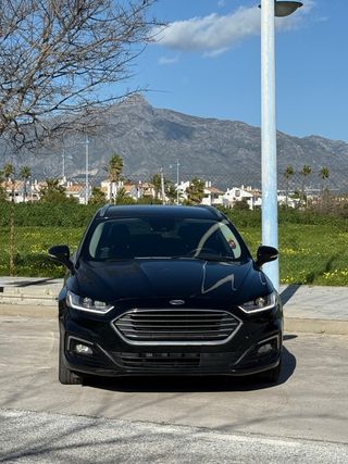 Ford Mondeo es un coche familiar espacioso y confortable con un motor diésel económico. El modelo es ideal para viajes largos gracias a su marcha suave, su gran maletero y su alto nivel de equipamiento. El coche combina la practicidad de un familiar, un comportamiento seguro en carretera y un buen nivel de confort tanto para el conductor como para los pasajeros. Una opción fiable, cómoda y muy versátil para la familia y los viajes. • Motor: diésel 2.0 Duratorq (150/163 CV) • Norma de emisiones: Euro 5 • Caja de cambios: automática Powershift (6 marchas) • Tracción: delantera (FWD) • Llantas de aleación de 18” • Luces automáticas con corrector automático de altura • Parabrisas calefactado • Luneta trasera calefactada • Boquillas del lavaparabrisas calefactadas • Interior: paquete de cuero Premium (Premium SVP) • Asientos delanteros calefactados con regulación de temperatura • Apoyo lumbar: conductor y acompañante • Iluminación interior y de los huecos para los pies • Iluminación de la guantera • Multimedios: sistema de navegación (versión alta) • Audio: 11 altavoces + subwoofer • Bluetooth / control por voz + USB • Antena / módulo GPS • Ordenador de a bordo (Trip computer) • Climatizador automático bizona • Acceso sin llave (Keyless) • Arranque sin llave / sistema de control remoto de puertas • Elevalunas eléctricos: delanteros y traseros, delanteros con función táctil • Retrovisores eléctricos: plegables, calefactados, con iluminación de cortesía e intermitentes integrados • Espejo retrovisor interior eléctrico • Cierre global (cierre de todas las ventanillas y puertas) • Cámara de visión trasera • Sensores de aparcamiento: delanteros y traseros • Control de crucero • Asistente de arranque en pendiente • ABS • Control de estabilidad ESP • Sistema de asistencia al frenado de emergencia • Aviso de cinturones de seguridad • Apertura remota del portón del maletero