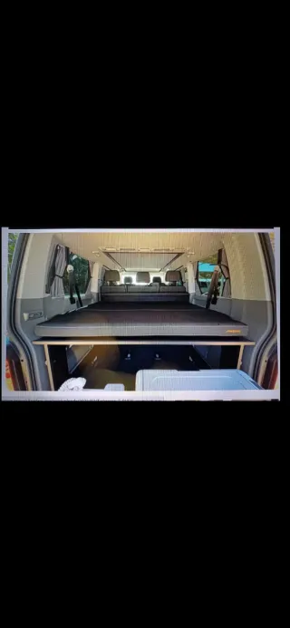 Furgoneta WOLVAGHEN CARAVELLE SEMINUEVA (Junio 2023) CAMPERIZADA por TINKERVAN con TECHO ELEVABLE. Consta de, una primera cama, de 2 m. largo X 1,50 m. ancho. La segunda cama en techo elevable soportando un peso de hasta 100 kg. Plataforma desplazable para cajas y maletas y otros enseres, con MUEBLE de COCINA de camping gas y FREGADERO con depósitos de aguas limpias y de aguas grises. FRIGORÍFICO ELÉCTRICO con capacidad de 45 kg. DUCHA portátil exterior con bomba. Cristales ahumados, con mosquiteras y con cortinas interiores, focos y luces laterales. Sillones delanteros giratorios hacia atras para crear un espacio con mesa y sillones para comer u otras actividades. Dos baterías, una la del coche y otra para luces, calefacción estacionaria...