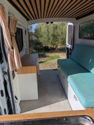 Furgoneta totalment equipada. Cocina, calefaccion, 2a bateria, placas solares, ducha exterior, capacidad de alamacenage, cama para 2 persones arriba, cama para una persona abajo que se combierte en mesa i asientos. Muy luminosa.