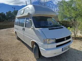 Furgoneta camper pequeña ideal para el día a día y fines de semana. Son 6 plazas homologadas para viajar y pueden dormir hasta 5 ya que tiene dos camas. Es totalmente original de Westfalia tipo California. El año pasado se le hizo revisión completa con bomba de agua y correa de distribución. Lleva las ruedas traseras nuevas. Es muy cómoda para escapadas en pareja o familia. Lleva calefacción estacionaria de serie y nevera de 9L bajo asiento. Asiento de copiloto giratorio y segunda batería nueva. ITV anual