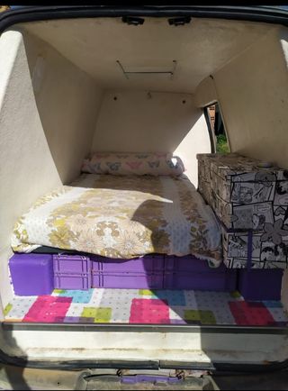 Furgo con todo lo necesario para iniciarte en el mundo Camper sin gastar mucho dinero, está equipada con batería auxiliar y tomas de 12v, luz interior, 2 neveras con un mueble aislante , cama de 1,05 con somier de láminas, cajas de almacenaje y claraboya con mosquitera. La ruedas delanteras están recién cambiadas. La pintura ya está un poco tocada. Pero de motor va perfecta , mejor oír el motor y probarla. No hago cambios, solo venta. Tiene 2 plazas delante