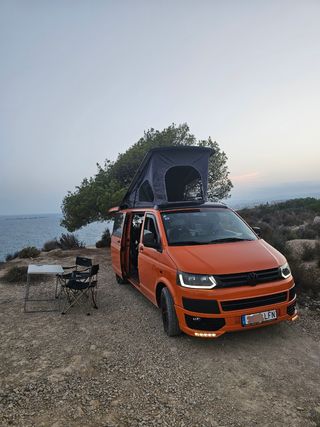 Volkswagen Transporter Camper. Todo homologado. ITV Anual. Válida hasta mayo del 2026. 321.000 kms y con mucha vida por delante. Ideal para fines de semana y puentes. Baca, placa solar y claraboya. < 2.20m de altura. (Entra practicamente en cualquier parking) Cocina y grifo con instalación para ducha exterior. 2 depositos de aguas limpias y uno de aguas grises. Nevera eléctrica Mobicool Q40 de 39L. (12V / 230v) Instalación eléctrica y batería auxiliar nuevas. Conexión al alternador mediante relé. (La batería aux. carga por la placa y el alternador del motor) Portabicicletas NUEVO y muchos extras más. Sillas, mesa y menaje de camping puede ser incluído 🏕️☺️. Lista para salir a disfrutar. La vendemos por cambiar de proyecto. Precio algo negociable.