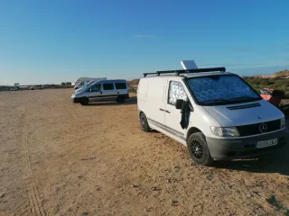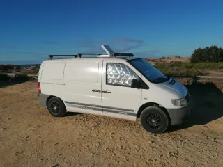 Mercedes Benz Vito W638 112 CDI 2.2 diésel 122 CV con 400.000 km Matrícula Extrajera Motor con 4 cilindros en línea con turbo e inyección directa Common Rail Potencia: 122 CV (90 kW) a aprox 3.800 rpm Par máx: aprox 300 Nm (≈30 kg·m) disponible entre 1.800 – 2.500 rpm Caja de cambios AUTOMÁTICA Velocidad máxima: ~170 km/h Aceleración 0–100 km/h: ~16 s Consumo mixto: 7,5 /100 km Equipamiento Westfalia CAMPERIZADA: Almacenamiento integrado con huecos para utensilios, posavasos, etc. Luces de lectura en la parte trasera y comedor. Grandisimo maletero y capacidad, incluso cuando la cama está montada. Mesa plegable extraíble zona comedor 7 plazas homologadas (2 delante, 2 centrales a contramarcha y 3 detrás) Asientos abatibles y se pueden desplazar por raíles, además se pueden quitar completamente de forma muy sencilla o incluso ponerlos en el sentido de la marcha. Asientos traseros convertibles en Cama de 180 cm ancho x uno 200 cm largo Ventanas laterales tintadas y homologadas Ventanas traseras con apertura y ventilación Elevalunas eléctricos Sistema de climatización / aire acondicionado Calefacción estacionaria (calienta el vehículo en pleno invierno, sin el motor encendido ni consumo de batería principal) Cortinas de la marca y mosquitera imantada para la puerta corredera. Doble baca en el techo Bola de enganche con cable para caravanas y remolques Extras y seguridad: ABS y sistema de frenos hidráulicos con discos delanteros y tambor ventilados. Dirección asistida Airbags Cinturones de tres puntos en todos los asientos. Radio/CD y altavoces de serie con muy buen sonido tanto delante como detrás. Cierre centralizado Alarma Dos llaves Revisiones recientes: Inyección totalmente nueva. Discos y pastillas nuevas. Cambio de aceite, filtros, un tubo del turbo, todos los bombones nuevos, arreglo de puerta copiloto que no abría, y un montón de detalles más. NO ARRANCA, creo es motor de arranque. ESCUCHO OFERTAS no absurdas, por favor.