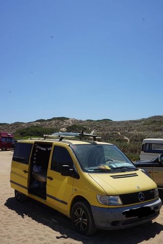 Mercedes Vito del 2001 camperizada. 300k kilómetros aprox. Aislamiento térmico y sonoro. Asientos giratorios. Cama con 5 plazas homologadas. Mueble cocina, para ropa y baúl interior. Mesa interior y exterior + 2 sillas. Techo solar. Toldo lateral y mosquiteras. Segunda batería. Baca y Baúl exterior. Porta bicicletas para 2 bicis. Pneumáticos recién cambiados. Solo ofertas serias.