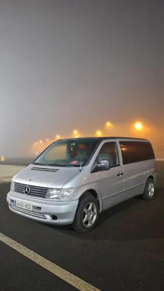 Furgoneta Mercedes Vito del año 1999 con 6 plazas y asientos abatibles para cama modo camper con mesita abatible, instalación electrica con enchufes y luces LED y batería secundaria. En buen estado, aunque con algún desperfecto en la chapa e interiores. ITV pasada en octubre de 2025.