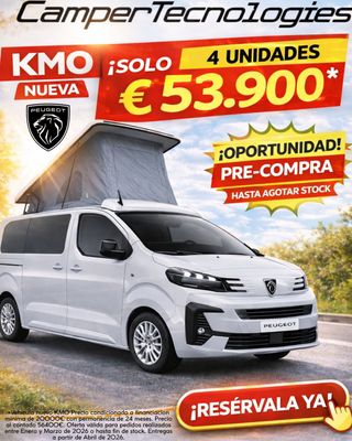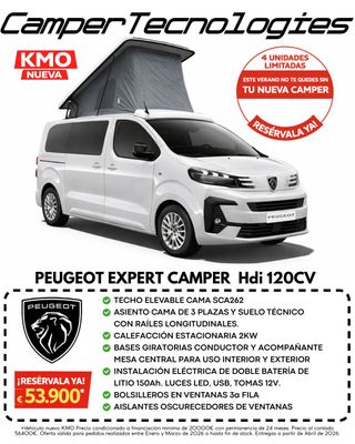 Presentamos la Peugeot Expert Camper 120 CV, el compañero perfecto para tus escapadas. Una camper KM0 a estrenar, con un equipamiento súper completo y lista para disfrutar desde el primer día 😍 Equipamiento incluido: 🌟 Techo elevable 🌟 Asiento cama de 3 plazas con suelo técnico y raíles longitudinales 🌟 Calefacción estacionaria de 2 kW 🌟 Bases giratorias en asientos de conductor y acompañante 🌟 Instalación eléctrica Quality Smart 12V con doble batería y batería de litio de 150Ah 🌟 Iluminación LED, tomas USB y tomas de 12V 🌟 Flexo LED en el techo elevable 🌟 Mesa central in/out para uso interior y exterior 🌟 Bolsilleros en ventanas traseras 🌟 Aislantes oscurecedores de ventanas 🚀 Solo 4 unidades KM0 a estrenar disponibles 📅 Primeras entregas a partir de abril de 2026 💰 Precio: 53.900 €* *Precio condicionado a financiación mínima de 20.000 € con permanencia de 24 meses 💶 Precio al contado: 56.400 € ☀️ Anticípate al verano y no te quedes sin tu nueva camper