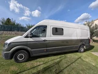 Volkswagen Crafter L4H3 140 2.0, semicamperizada con 3 asientos delante. Primera matriculación el 06/2019, solo 52.500km. Cama 140x180cm. Banco de almacenaje/Asiento de 120cm. Mueble cocina con fregadero. Sistema de agua corriente con depósito de aguas limpias de 100L, 2 depositos de aguas grises de 20L. Nevera/congelador Coolzone RCE170L. Sistema eléctrico interior a 12V y 230V y con control Bluetooth. Placa solar 300W, batería Litio 200Ah, inversor de corriente, protector de la batería, protecciones del sistema eléctrico y Booster (Instalado 09/2025). Toma eléctrica en exterior del vehículo y boca de llenado de agua. Portabicicletas. Todo homolagado como Furgón Vivienda (2448). Pasada revisión y cambios de filtros y aceite el 09/2025. Batería del vehículo recien cambiada el 10/2025.